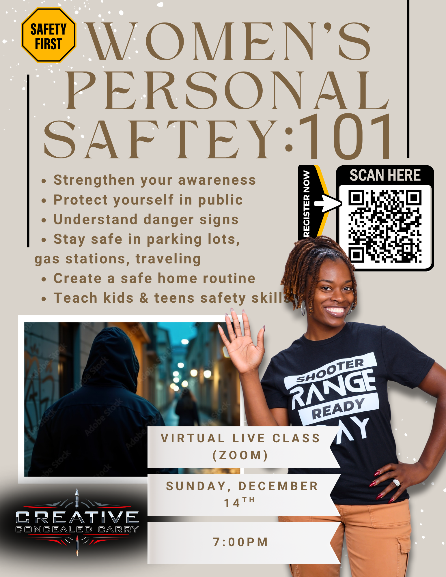 Women deserve to feel safe — not scared. This live virtual class teaches real-world strategies you can use immediately in your daily life.